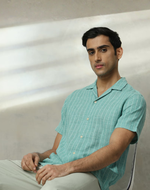 This Mint Green Stripe Shirt elevates your presence without trying too hard. The vertical stripes visually increase height and give you a sharp, elongated appearance. Crafted in lightweight cotton, this shirt keeps you cool and comfortable throughout the day—perfect for office hours, semi-formal events, or casual social outings.